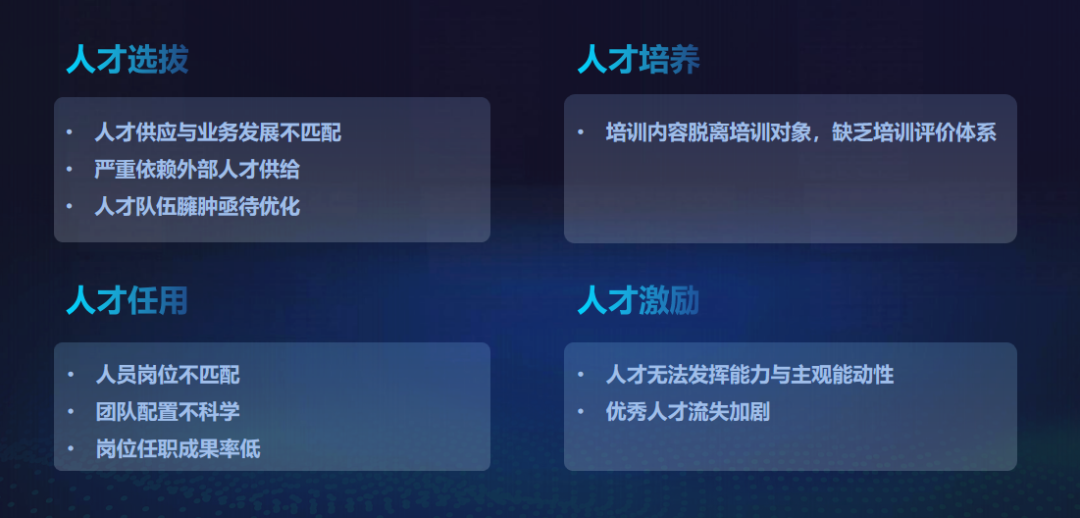 人才供应与业务发展不匹配:人才队伍臃肿,人员岗位不匹配,团队配置不科学,导致岗位任职成果率低。 -
